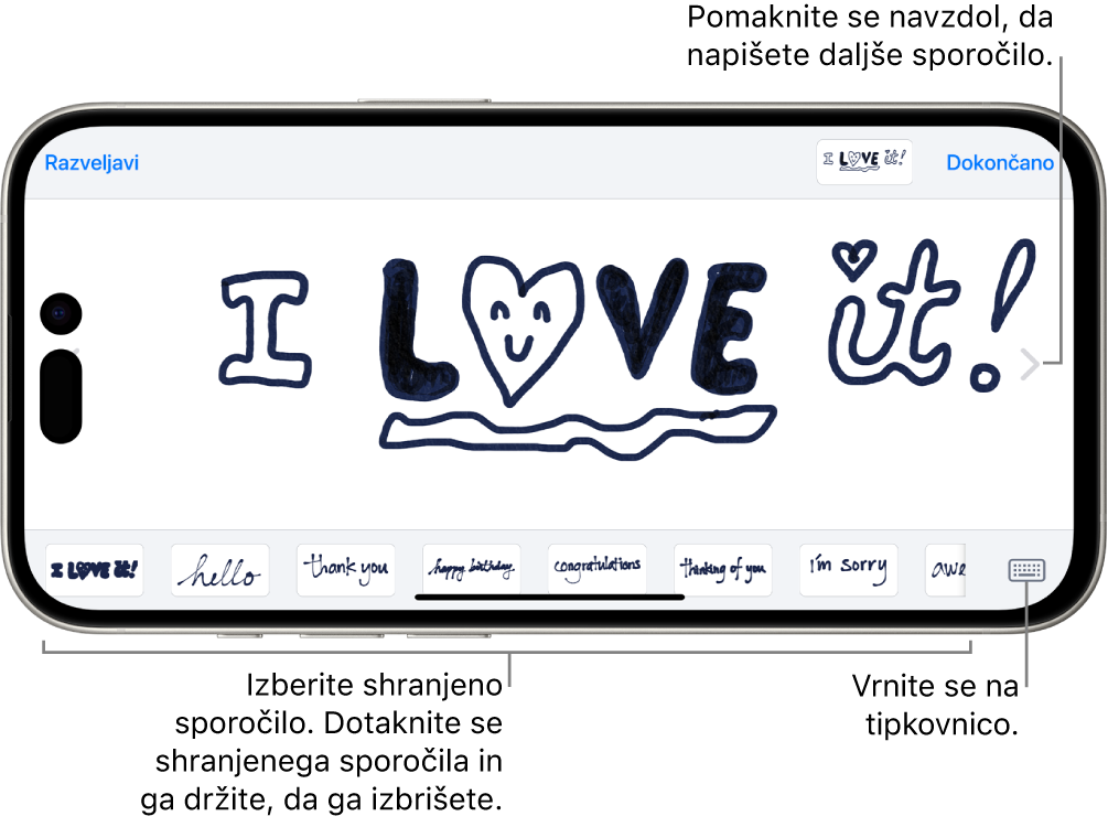 na tipkovnici.Sporočilo napišite s prstom ali izberite shranjeno sporočilo na dnu in tapnite Dokončano.