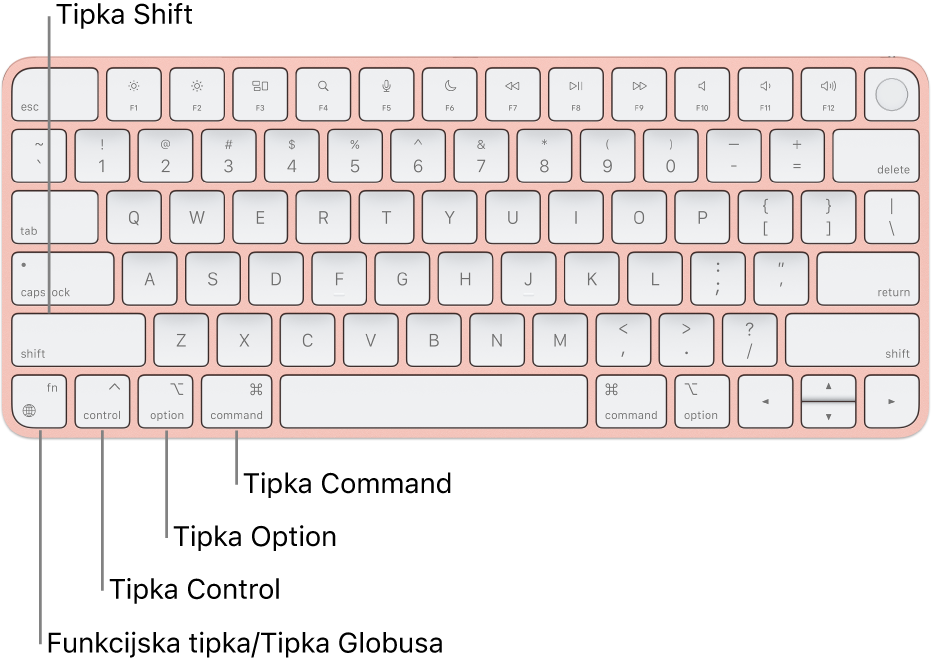 Opomba. na tipkovnici Apple Magic Keyboard s funkcijo Touch ID in številčnico je funkcijska tipka oziroma tipka Globus desno od tipke Delete.