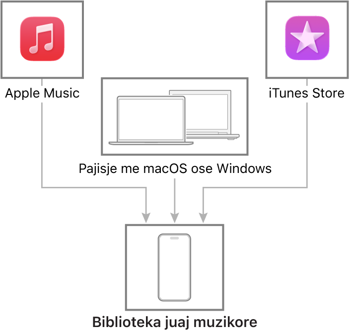 Lidhni pajisjen tuaj Mac ose Windows për të transferuar dhe përditësuar muzikë midis iPhone dhe pajisjes tuaj. Për të sinkronizuar përmbajtjen e mbështetur, përdorni Music (macOS 10.15 ose version më i ri) ose iTunes (macOS 10.14 ose më i hershëm dhe pajisjet Windows).