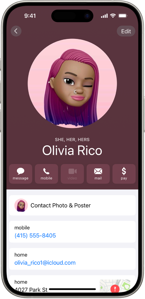 iPhone користи ваш Apple Account за креирање контакт картице под називом My Card у апликацији Contacts. Такође, можете да додате или уредите детаље, између осталог своје име, адресу, број телефона и рођендан, као и Contact Poster који можете да делите са људима када их позовете или им пошаљете поруку.