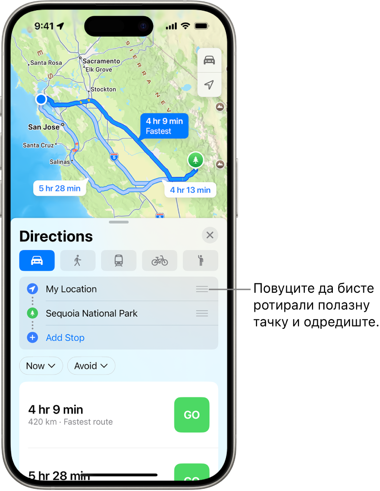 Када тапнете на Go: Тапните на картицу руте при дну екрана, а затим тапните на