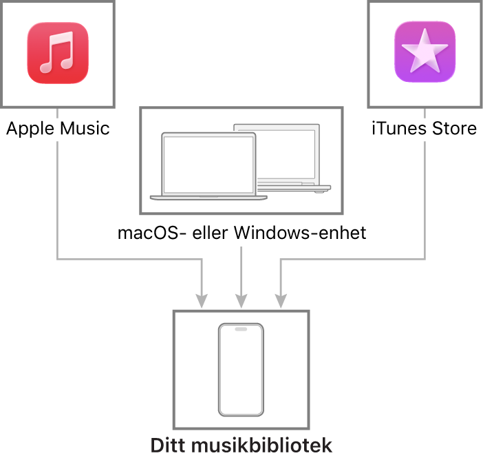 Anslut din Mac eller Windows-enhet så kan du överföra och uppdatera musik mellan iPhone och enheten. Synkronisera innehåll som stöds med Musik (macOS 10.15 eller senare) eller iTunes (macOS 10.14 eller tidigare och Windows-enheter).