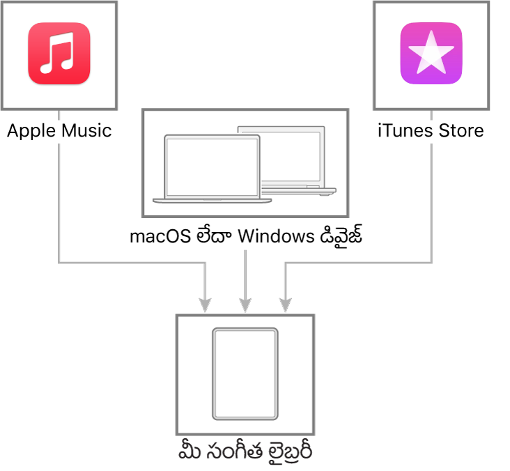 మీ iPad, మీ డివైజ్ల మధ్య సంగీతాన్ని బదిలీ చేసి, అప్డేట్ చేయడానికి Mac లేదా Windows డివైజ్ను కనెక్ట్ చేయండి. మద్దతు ఉన్న కంటెంట్ను సింక్ చేయడం కోసం, సంగీతం (macOS 10.15 లేదా తర్వాతి వెర్షన్) లేదా iTunes (macOS 10.14 లేదా మునుపటి వెర్షన్, Windows డివైజ్లు) ఉపయోగించండి.