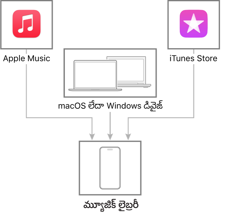 మీ iPhone, మీ డివైజ్ల మధ్య సంగీతాన్ని బదిలీ చేసి, అప్డేట్ చేయడానికి మీ Mac లేదా Windows డివైజ్ను కనెక్ట్ చేయండి. మద్దతు ఉన్న కంటెంట్ను సింక్ చేయడానికి, సంగీతం (macOS 10.15 లేదా తర్వాతి వెర్షన్) లేదా iTunes (macOS 10.14 లేదా మునుపటి వెర్షన్, Windows డివైజ్లు) ఉపయోగించండి.