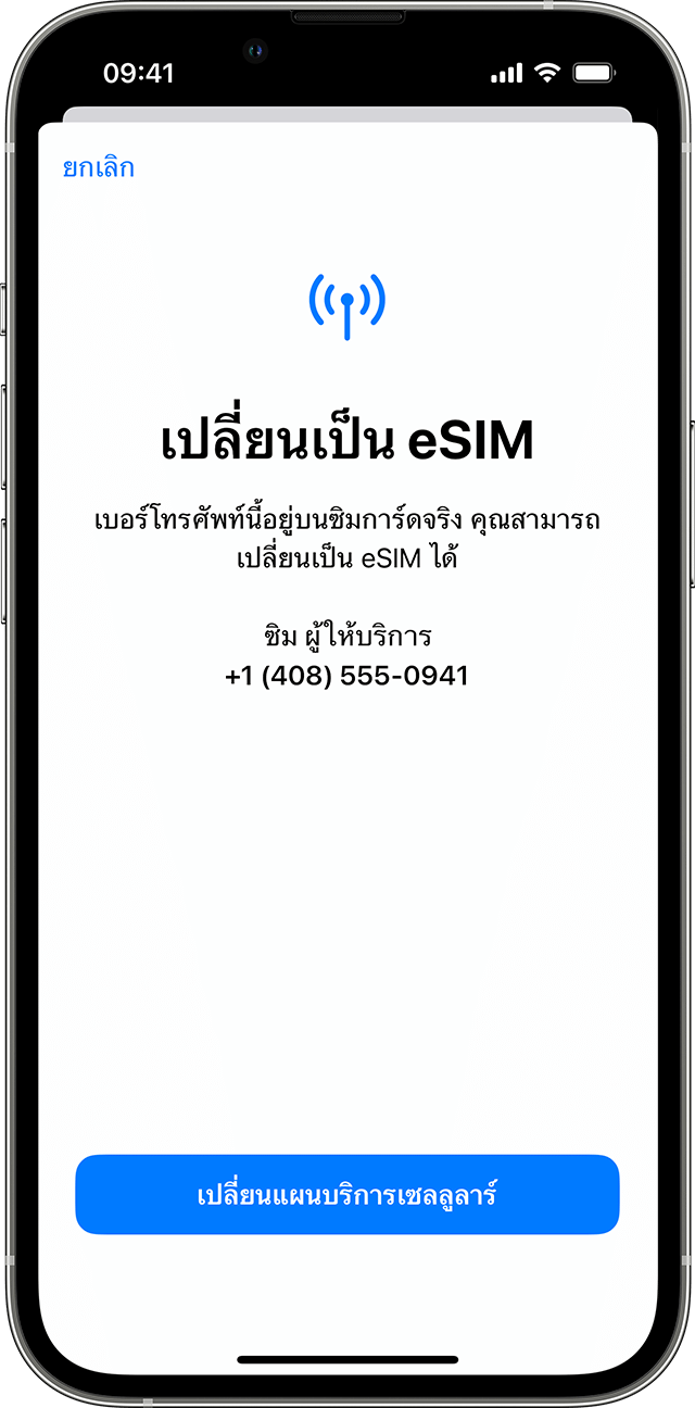 หากคุณไม่เห็น "แปลงเป็น eSIM" แสดงว่าผู้ให้บริการเครือข่ายไม่รองรับตัวเลือกนี้ ติดต่อผู้ให้บริการเครือข่ายเพื่อย้ายหมายเลขโทรศัพท์จากซิมจริงไปยัง eSIM โดยใช้การเปิดใช้งาน eSIM โดยผู้ให้บริการเครือข่ายหรือสแกนรหัส QR - แตะเปลี่ยนแผนบริการเซลลูลาร์