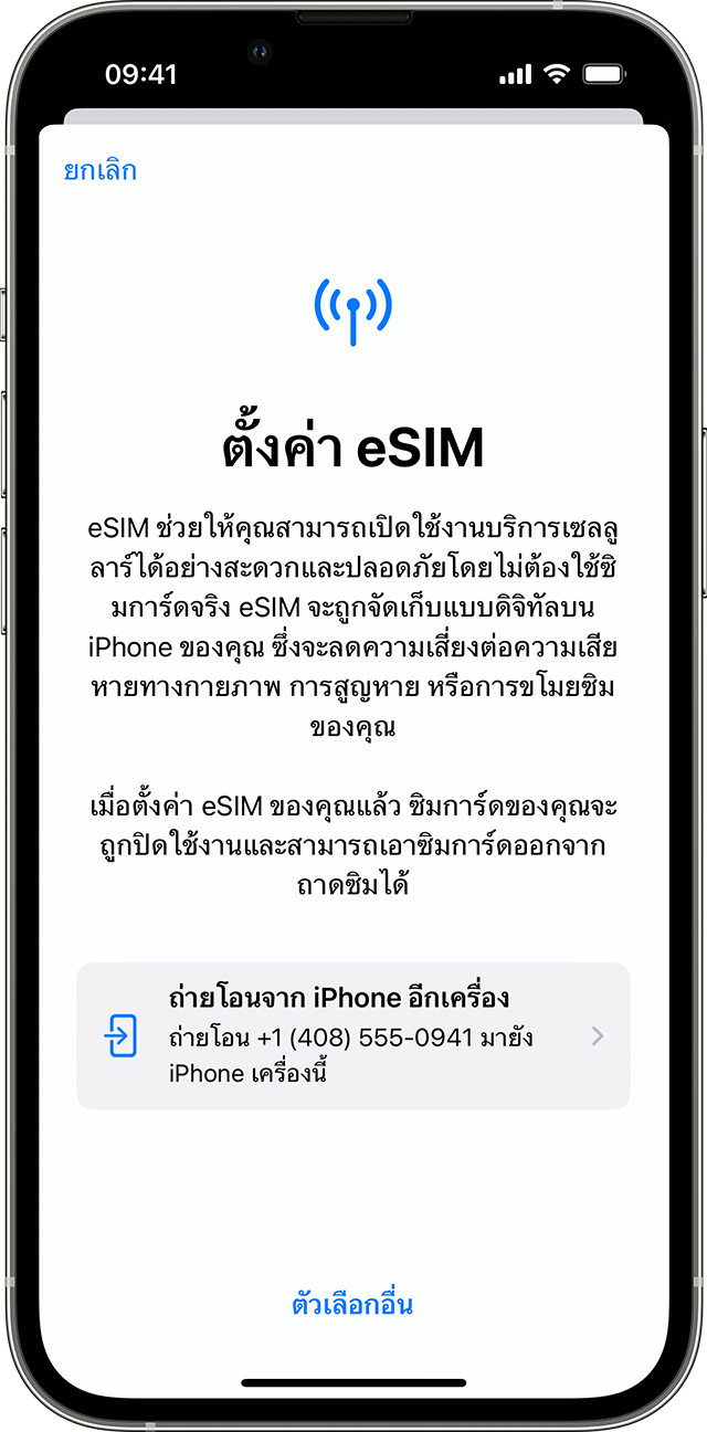 คุณสามารถใช้ตัวเลือกเหล่านี้ในภายหลังเพื่อเพิ่มหรือโอนย้าย eSIM ได้เช่นกัน หากตัวเลือกเหล่านี้ไม่สามารถใช้ได้ โปรดติดต่อผู้ให้บริการเครือข่ายของคุณเพื่อเปิดใช้งาน eSIM โดยใช้รหัส QR หรือแอป iPhone ของผู้ให้บริการเครือข่าย