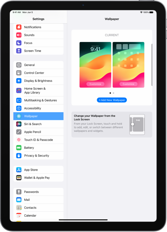 บน iPad คุณสามารถเลือกภาพหรือรูปภาพเป็นภาพพื้นหลังสำหรับหน้าจอล็อคหรือหน้าจอโฮมได้ คุณสามารถเลือกจากภาพฉากไดนามิกและภาพฉากนิ่งได้