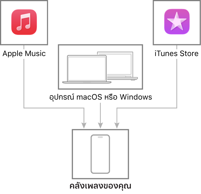 เชื่อมต่อ Mac หรืออุปกรณ์ Windows ของคุณเพื่อถ่ายโอนและอัปเดตเพลงระหว่าง iPhone กับอุปกรณ์ของคุณ ในการเชื่อมข้อมูลเนื้อหาที่รองรับ ให้ใช้แอปเพลง (macOS 10.15 ขึ้นไป) หรือ iTunes (macOS 10.14 หรือก่อนหน้า และอุปกรณ์ Windows)