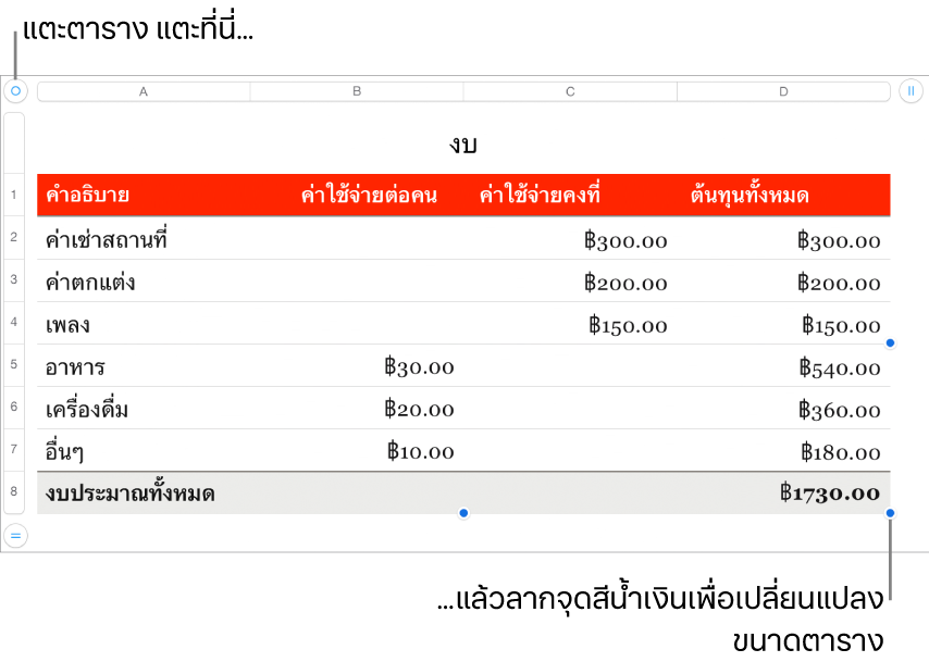 ที่มุมซ้ายบนสุดของตารางลากจุดสีน้ำเงินใดๆ บนขอบของตารางเพื่อทำให้ตารางใหญ่ขึ้นหรือเล็กลง