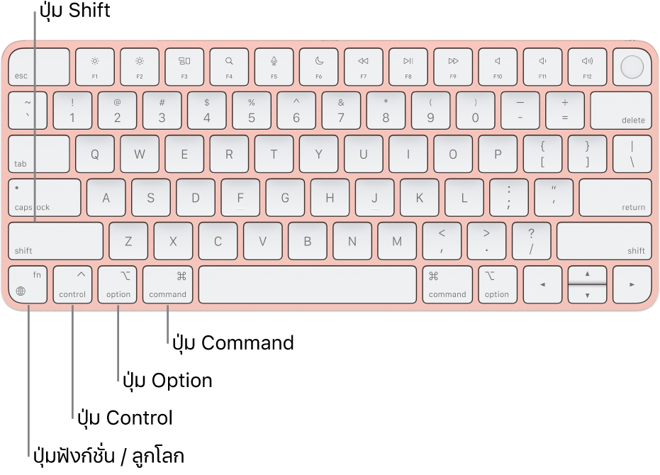 หมายเหตุ: ถ้าคุณมี Magic Keyboard ของ Apple ที่มี Touch ID และปุ่มตัวเลข ปุ่มฟังก์ชั่น/ลูกโลกจะอยู่ทางด้านขวาของปุ่มลบ