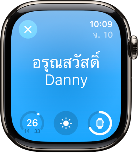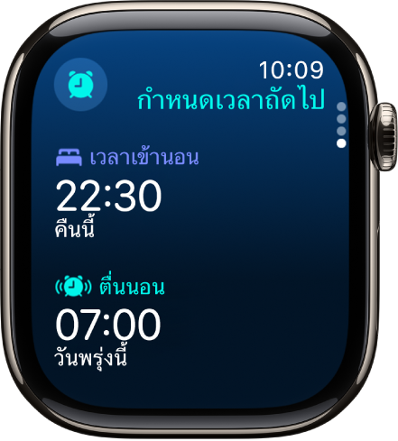 ในการตั้งเวลาตื่นนอนใหม่ ให้แตะเวลาตื่นนอน แล้วหมุน Digital Crown เพื่อตั้งเวลาใหม่ จากนั้นแตะ