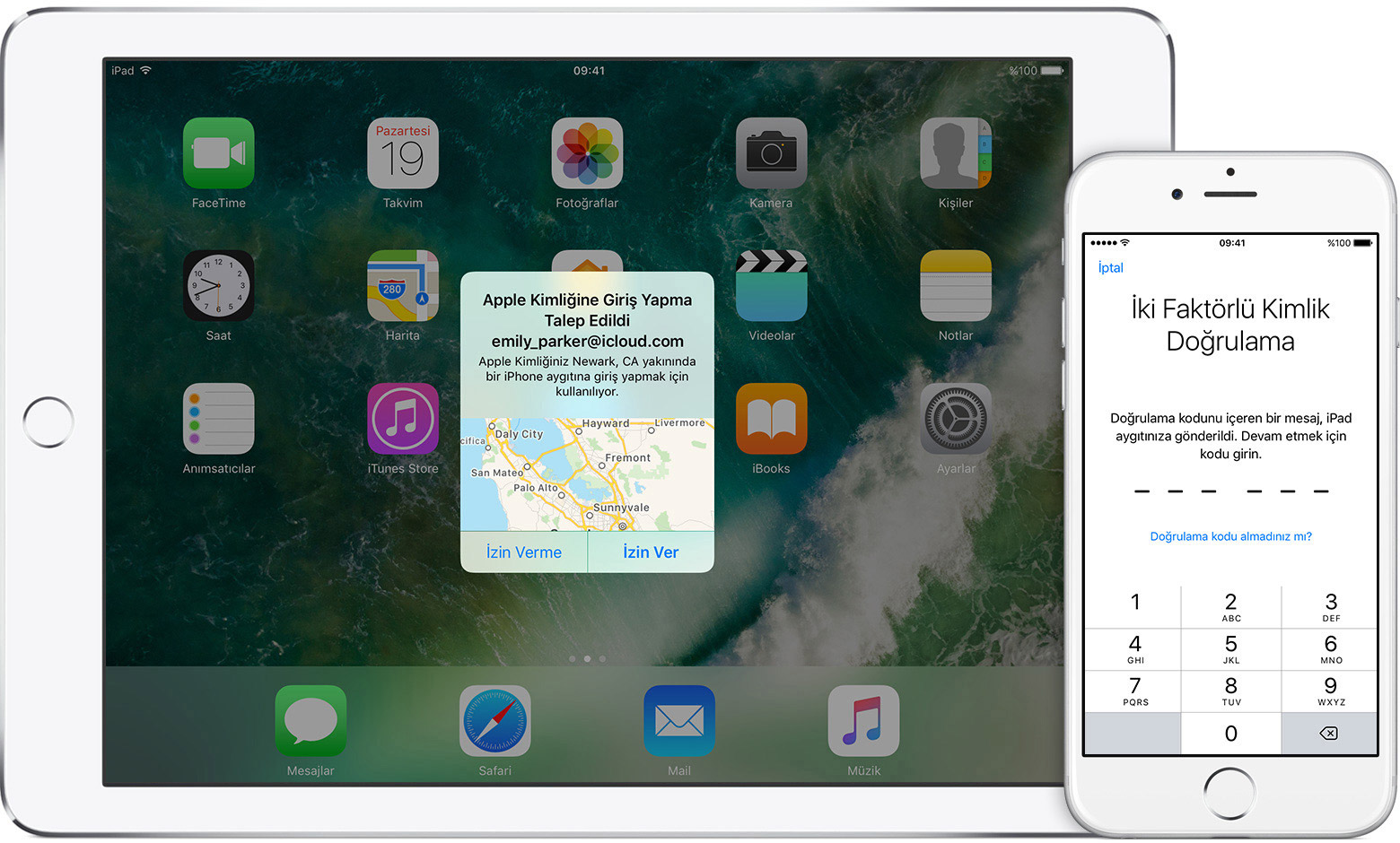 İki faktörlü kimlik doğrulamayla hesabınıza yalnızca iPhone, iPad veya Mac'iniz gibi güvendiğiniz aygıtlar üzerinden erişilebilir. Yeni bir aygıtta ilk kez giriş yapmak istediğinizde iki bilgiyi sağlamanız gerekir. Bunlar parolanız ve güvenilir aygıtlarınızda otomatik olarak görüntülenen altı basamaklı doğrulama kodudur. Kodu girerek yeni aygıta güvendiğinizi doğrulamış olursunuz. Örneğin, bir iPhone'unuz varsa ve yeni satın aldığınız bir Mac'te hesabınıza ilk kez giriş yapıyorsanız parolanızı ve iPhone'unuzda otomatik olarak görüntülenen doğrulama kodunu girmeniz istenir.