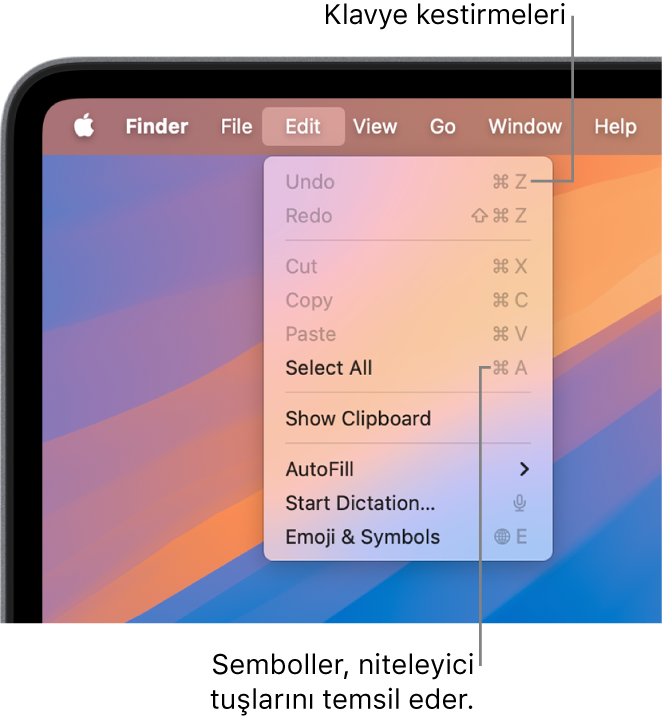 Not: Uygulamalardaki klavye kestirmeleri, Mac’inizde kullandığınız dile ve klavye yerleşimine bağlı olarak değişebilir. Aşağıdaki kestirmeler beklediğiniz gibi çalışmıyorsa doğru kestirmeleri görmek için menü çubuğundaki uygulama menülerine bakın. Giriş kaynağı olarak bilinen şu anki klavye yerleşiminizi görmek için Klavye Görüntüleyici‘yi de kullanabilirsiniz.