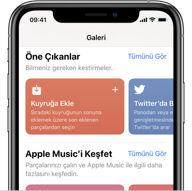 Galeri’de yaratıcı ve kullanışlı kestirmelerden oluşan, özel olarak seçilmiş bir koleksiyon bulunmaktadır. Kestirme olasılıklarına göz atmak ve nasıl oluşturulduklarını görmek için Galeri’yi keşfedin. Beğendiğiniz bir Galeri kestirmesi bulduğunuzda, bunu tek bir dokunuşla Kestirmelerim koleksiyonunuza ekleyebilir ve gereksinimlerinize göre özelleştirebilirsiniz.