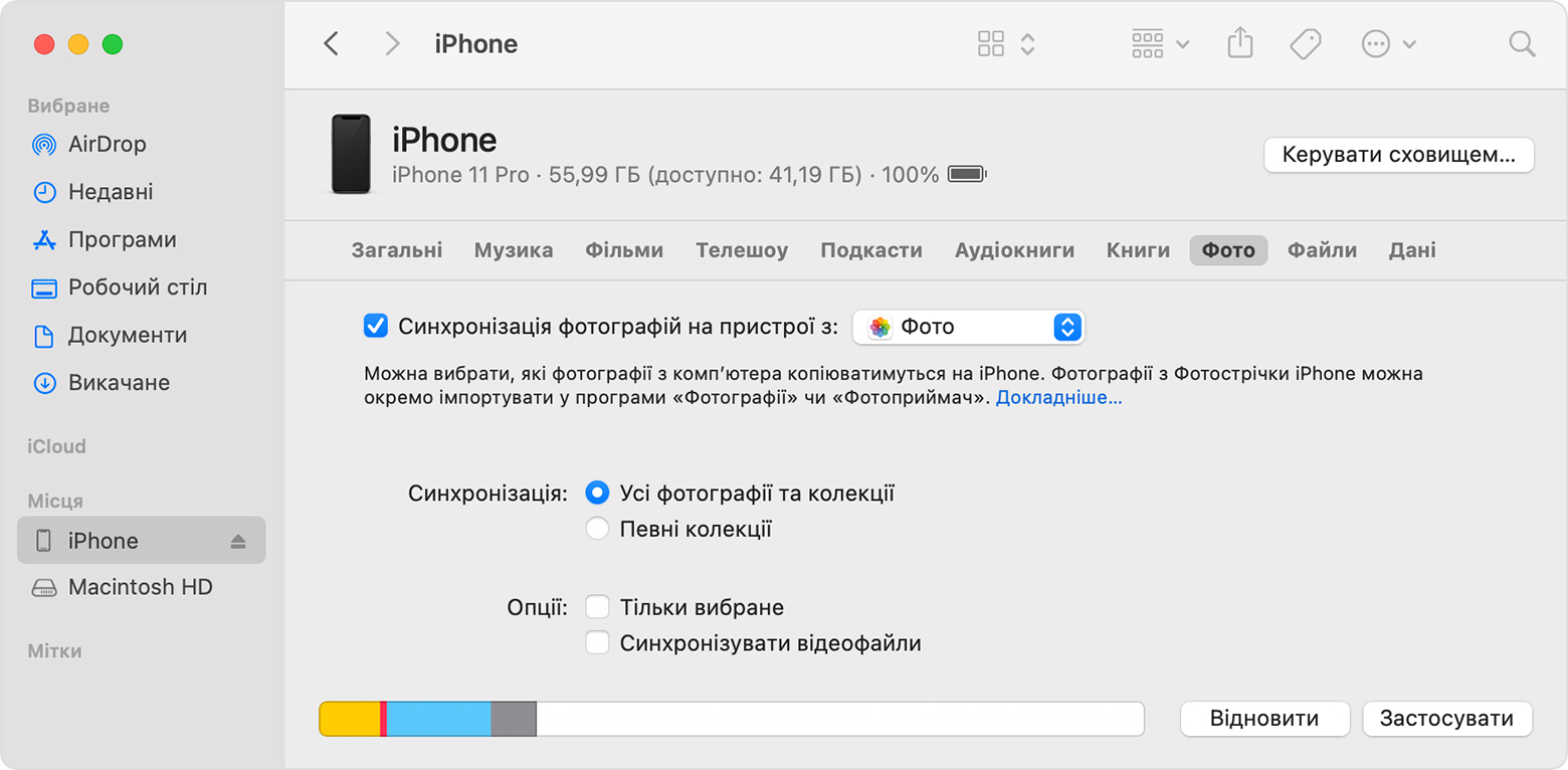 Ви можете скористатися Finder на комп’ютері Mac, щоб синхронізувати свої фотографії з iPhone, iPad або iPod touch із програми «Фотографії» або з папки на комп’ютері. Щоразу, коли ви синхронізуєте свій пристрій iOS із комп’ютером, фотографії та відео на цьому пристрої iOS оновлюються відповідно до альбомів на комп’ютері. Дізнайтеся, як імпортувати зі свого пристрою iPhone, iPad або iPod touch фотографії, яких немає на комп’ютері.