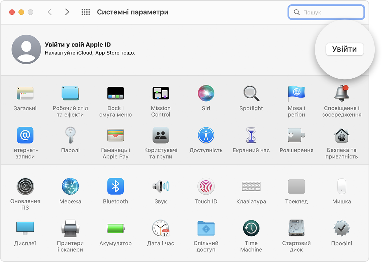 - На комп’ютері Mac: перейдіть у меню Apple > «Системні параметри», а потім виберіть «Apple ID» й увійдіть у систему за допомогою свого ідентифікатора Apple ID.