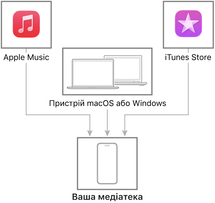 Під’єднайте iPhone до комп’ютера Mac або пристрою Windows, щоб передавати музику на них. Синхронізувати підтримуваний вміст можна за допомогою програми «Музика» (macOS 10.15 або новіша версія) або iTunes (macOS 10.14 або попередні версії та Windows).