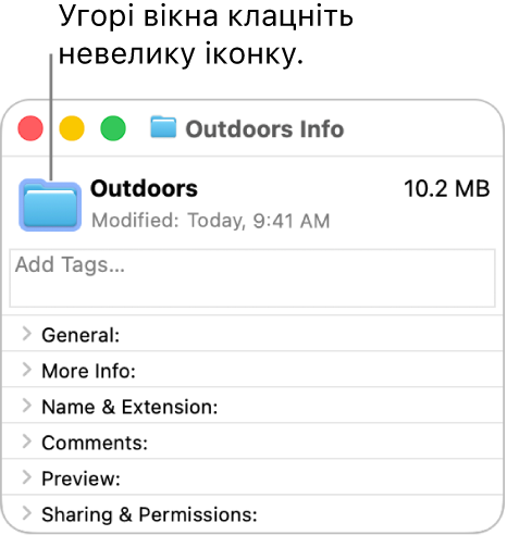 У вікні «Інформація» клацніть маленьку іконку вгорі вікна під смугою заголовка.