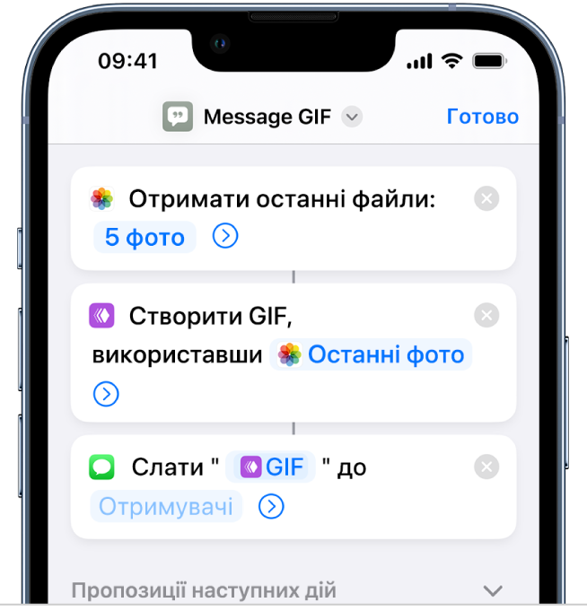 Дія — це елемент побудови швидкої команди, тобто одиничний крок у завданні. Змішуйте та добирайте дії для створення швидких команд, що взаємодіють із програмами та вмістом на ваших пристроях Apple, а також вмістом і службами в інтернеті. Кожна швидка команда складається з одної чи більше дій.