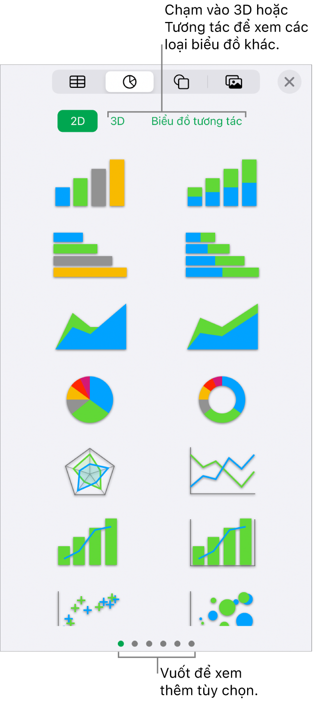 .Chạm vào 2D, 3D hoặc Tương tác để xem loại biểu đồ bạn có thể thêm, sau đó vuốt sang trái hoặc phải để xem thêm tùy chọn cho từng loại biểu đồ.