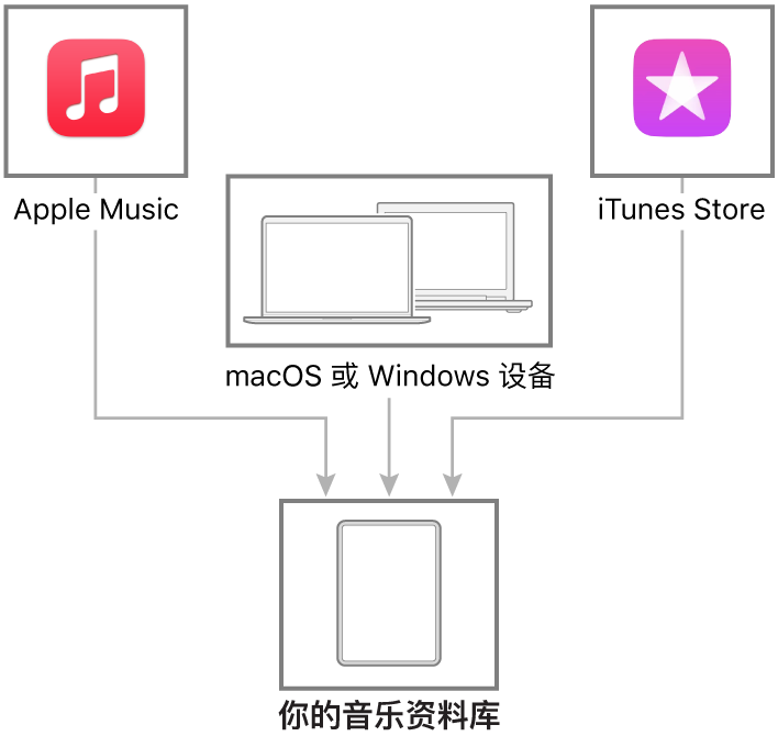 如果没有订阅 Apple Music 但想要添加喜爱的歌曲或专辑,你可以从 iTunes Store 购买和下载音乐。如果之前从 iTunes Store 购买了项目,你可以将项目下载到已授权的电脑和设备上(最多共计 10 台)。