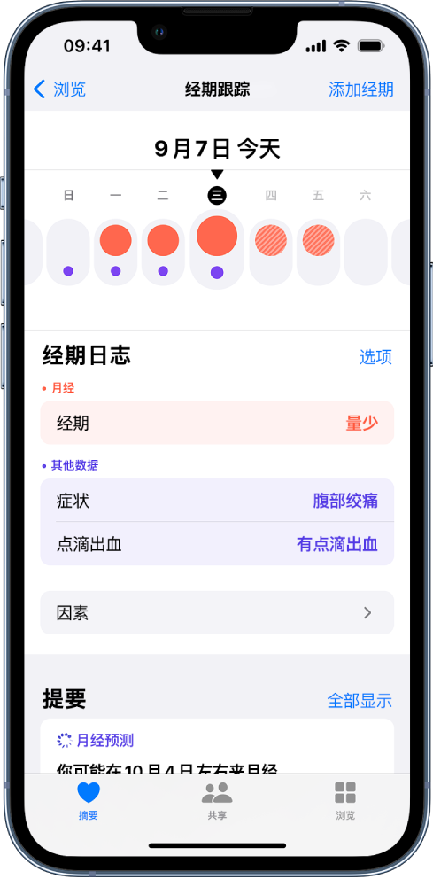 ,然后轻点“经期跟踪”。轻点“因素”,然后执行以下任一项操作: