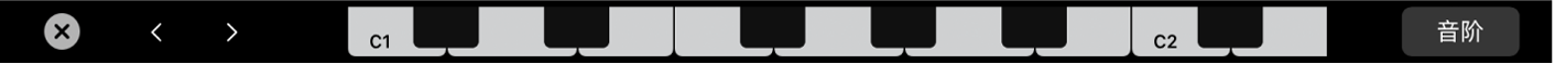 若要调整触控栏键盘的八度音程范围,请轻点触控栏键盘左侧的其中一个“键盘八度音程”按钮。