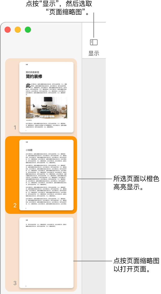 若要更方便导航文稿,你可以在 Pages 文稿窗口左侧打开边栏以显示文稿页面的缩略图图像或目录。还可以从“显示”菜单中选取目的位置和使用键盘快捷键导航文稿。