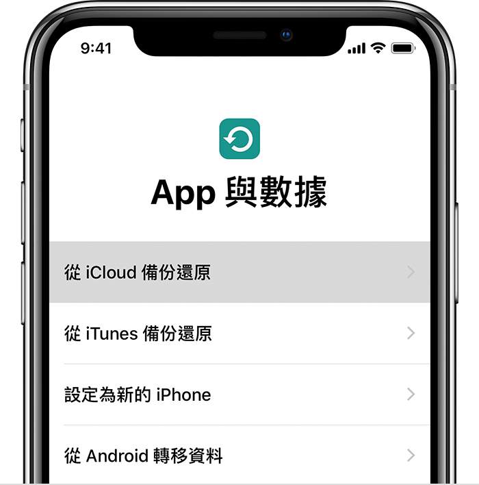 2. 請依照畫面上的設定步驟操作,直至出現「轉移 App 與資料」畫面,然後點一下「從 iCloud 備份」。