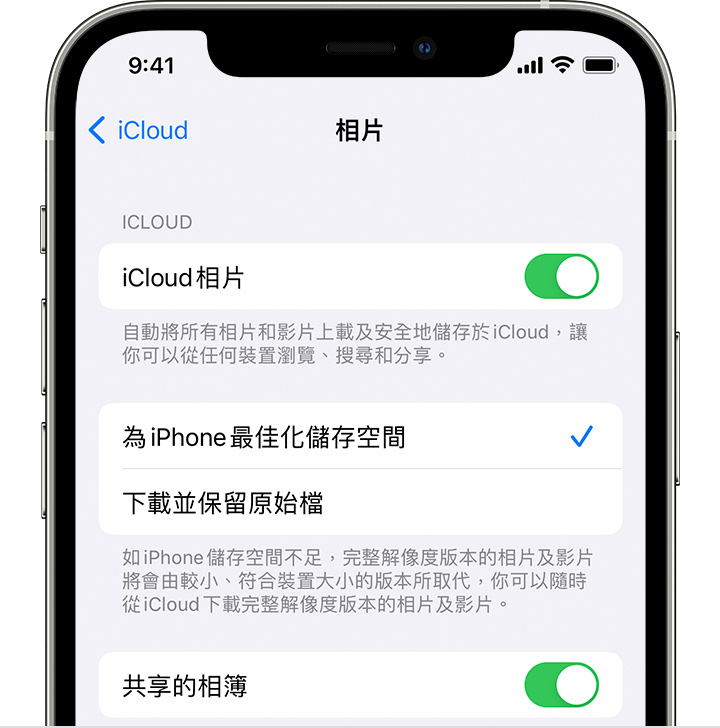 「iCloud 相片」會以原始高解像度版本儲存所有相片和影片。如要在裝置上騰出儲存空間,你可以啟用「最佳化儲存空間」。