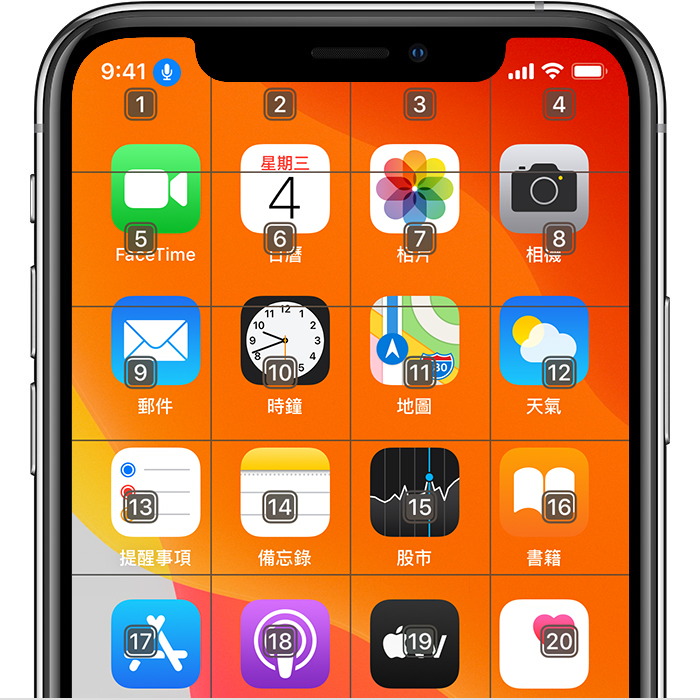 如果有關互動需要更準確操作或提述空間位置,你可以說「顯示格線」,讓畫面覆疊顯示標有數字的格線。說出格線上的數字,便可放大該格線範圍,並顯示一組新數字,讓你更容易選擇項目。你亦可以使用格線,助你將畫面中的項目拖放到所需位置,或用來進行手勢或徒手操作。