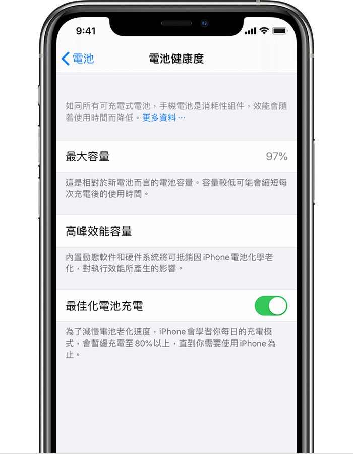 在設定 iPhone 或更新至 iOS 13 或以上版本時,「最佳化電池充電」功能會預設為開啟。如要關閉此功能,請前往「設定」>「電池」>「電池健康度」>「最佳化電池充電」。