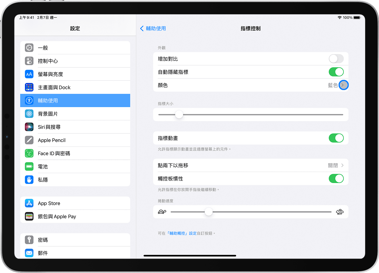 如要更改游標外觀和操作方式,請開啟「設定」app 並點一下「輔助使用」>「指標控制」。在那裡,你可以自訂以下功能: