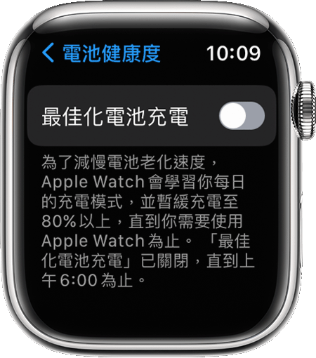 「最佳化充電上限」會了解你每日的使用情況,釐定何時充電至最佳化上限,何時允許充滿電。當你設定手錶時,此功能預設為開啟狀態。