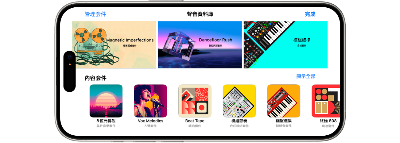 使用「聲音資料庫」下載和管理包含數百個循環樂段、聲音、「觸碰式樂器」、鼓組等等的聲音套件。GarageBand 會通知你何時可以下載新的聲音套件。