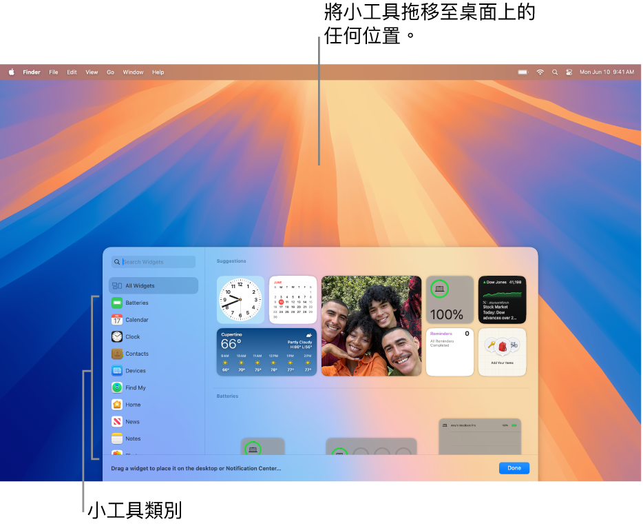 在 Mac 上將小工具加至桌面或「通知中心」,以便密切留意你的行程、常用裝置、天氣,以及熱門頭條等。