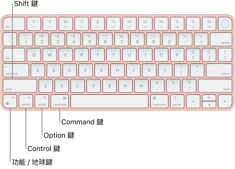 備註:如你擁有配備 Touch ID 和數字鍵盤的 Apple 精妙鍵盤,功能/地球鍵是在 Delete 鍵的右側。