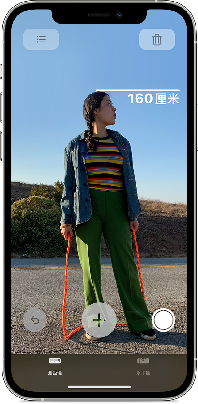 「測距儀」app 使用擴增現實 (AR) 技術將你的裝置變成量尺。你可以測量物體的大小,自動偵測矩形物體的尺寸,並保存測量結果的相片。此外,iPad Pro 12.9 吋 (第 4 代)、iPad Pro 11 吋 (第 2 代)、iPhone 12 Pro 和 iPhone 12 Pro Max 會顯示指引線,讓你更輕鬆地測量物體、量度身高,以及查看測量記錄。