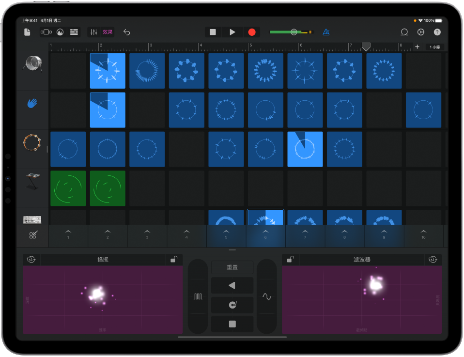 使用「即時循環樂段」,簡單地點一下格線中的輸入格與直欄來觸發音樂循環樂段,即可創作電子音樂。你可以建立自己的編曲,然後即興創作並錄製「即時循環樂段」表演。