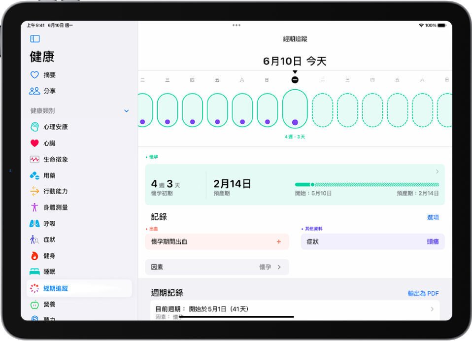 在「健康」App 中記錄懷孕資料時,你可以檢視你的懷孕週數和記錄懷孕期間常見的症狀。「健康」App 可針對你的身體和心理健康變化進行調整和提供建議,幫助你更深入瞭解懷孕期間的資料。