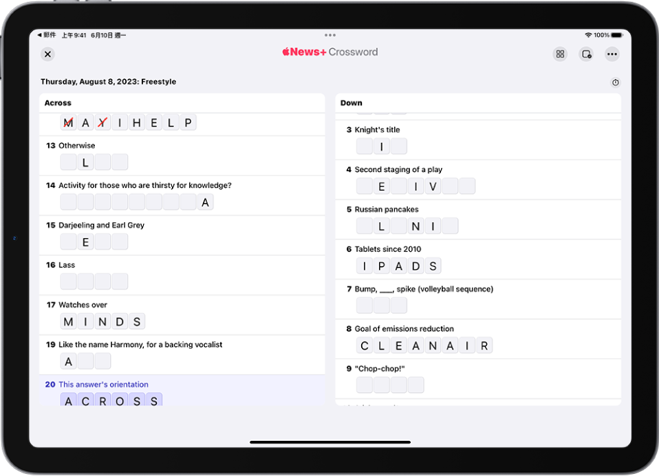 你也可以透過多種方式瀏覽和玩填字及迷你填字遊戲。例如,你可以用傳統的格狀顯示方式顯示益智遊戲,或選擇以列表顯示線索和答案。你可以點一下方格來選取字詞,或是從列表中選擇線索。