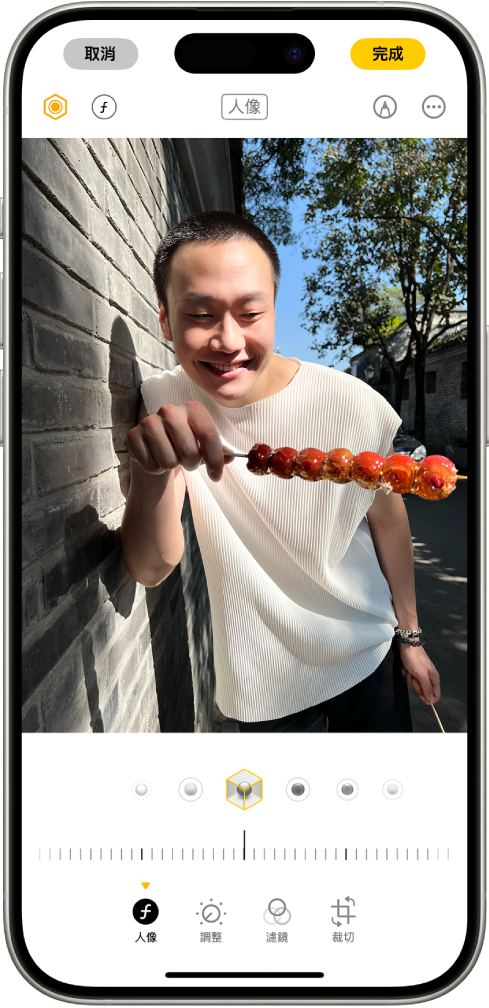 在「照片」App 中,你可以對以「人像」模式拍攝的照片更改和調整燈光效果、景深和焦點。