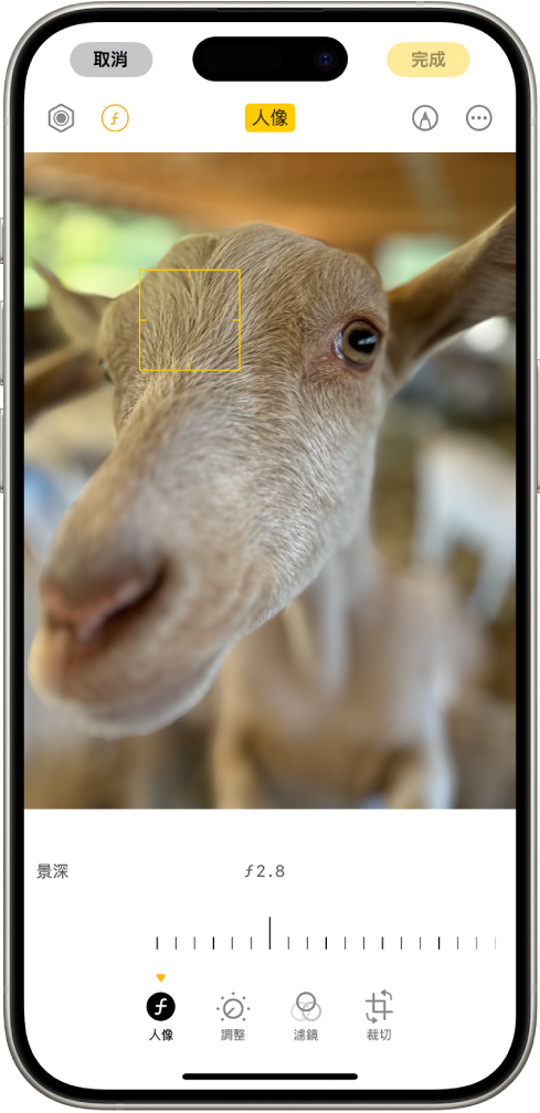 你可以更改人像的主體或焦點(適用於 iPhone 13 或後續機型)。當你選取新主體時,背景模糊度會自動調整,讓新主體顯得清晰且對焦。請確認新主體沒有模糊化或在遠處。