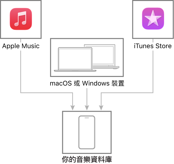 連接 Mac 或 Windows 裝置來在 iPhone 與裝置之間移轉和更新音樂。若要同步支援的內容,請使用「音樂」(macOS 10.15 或以上版本)或 iTunes(macOS 10.14。或較早版本和 Windows 裝置)。
