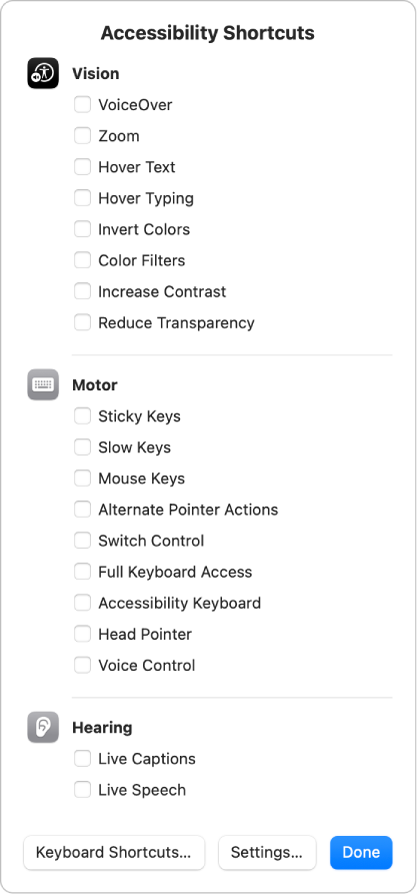 你可以使用鍵盤快速鍵來打開「輔助使用快速鍵」面板,該面板可讓你開啟或關閉輔助使用功能。