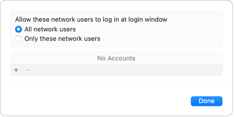 若你的 Mac 已加入網路帳號伺服器,你可以指定哪些網路使用者可以登入你的 Mac。