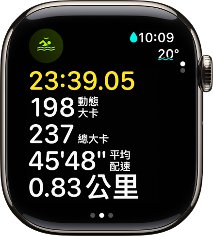 若要暫停或繼續游泳,請同時按下數位錶冠和側邊按鈕。若要檢閱你的游泳體能訓練摘要,請解鎖 Apple Watch,然後點一下「結束」。