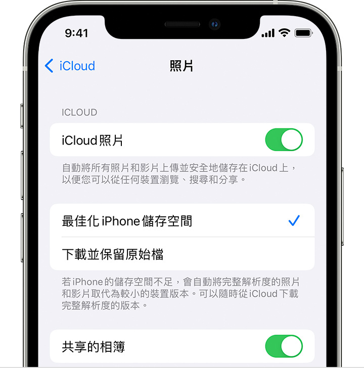 「iCloud 照片」會按原始高解析度版本保存所有照片和影片。 若要節省裝置上的儲存空間,您可以開啟「最佳化儲存空間」。