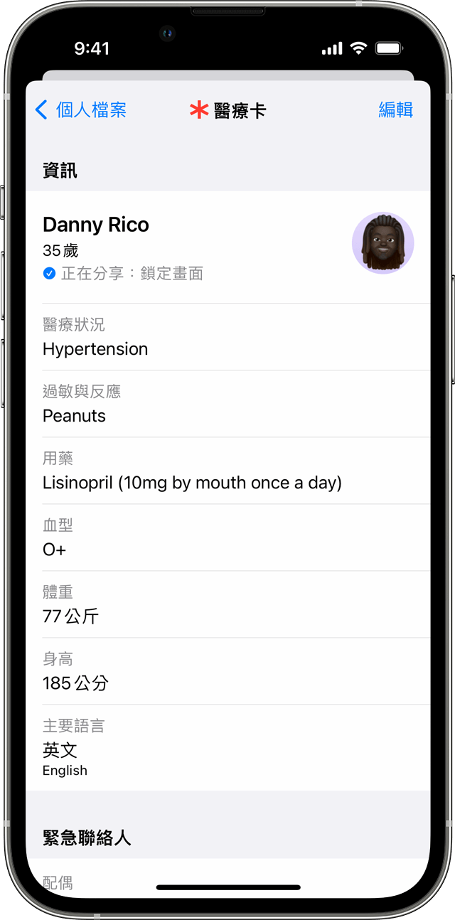 - 點一下「編輯」,然後捲動到「緊急聯絡人」。